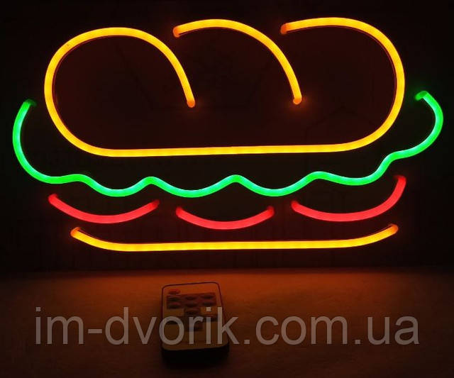 Неонова вивіска "Бургер" 350х200мм різнокольорова з димером і блоком живлення